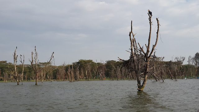 Marabou Storks nestling atop submerged dying Acacia trees at the edge of the lake. With the recent rise in the level of the lake waters, the trees growing on the banks have slowly succumbed to effects of oxygen-poor water-logged soils